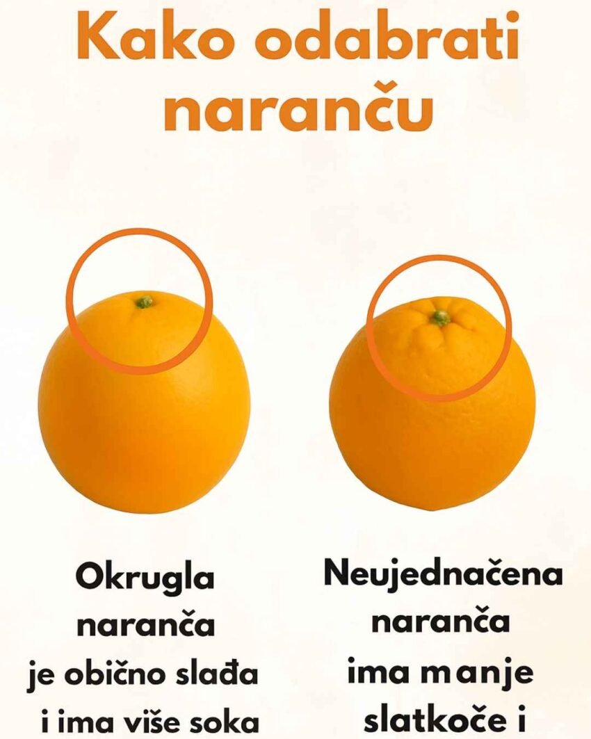 🍊 Birajte narandže s pravilnim, okruglim oblikomNarandže koje imaju ujednačen, okrugao oblik obično su bolje razvijene i prirodno sočnije. One nepravilnog oblika mogu imati slabiji ukus ili biti nejednako sazrele.