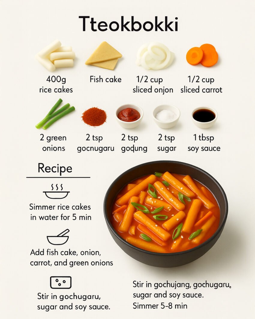 Danas se tteokbokki prodaje gotovo na svakom uglu Seula, od malih štandova do restorana, a svaka verzija ima svoj jedinstveni šarm. Neki ga prave s dodatkom kuhanih jaja, ribljih kolačića (odeng), povrća, ili čak instant rezanaca (ramyeon), što ga čini još bogatijim i ukusnijim obrokom. 🍳🥢