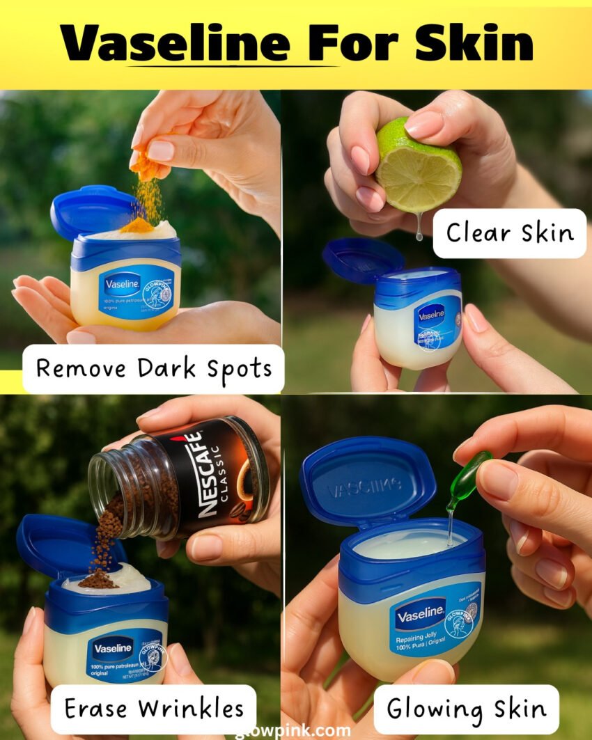 Vaseline je od strane dermatologa odobren emolijent koji zadržava do 99% vlage u koži. Savršen je kao baza za balzame i maske koje ciljaju bore, tamne mrlje i umoran ten. Kombinovan s kuhinjskim sastojcima poput kafe, limuna, vitamina E, kurkume, cvekle, aloe vere i zelenog čaja, možeš napraviti sedam jednostavnih DIY recepata koji: