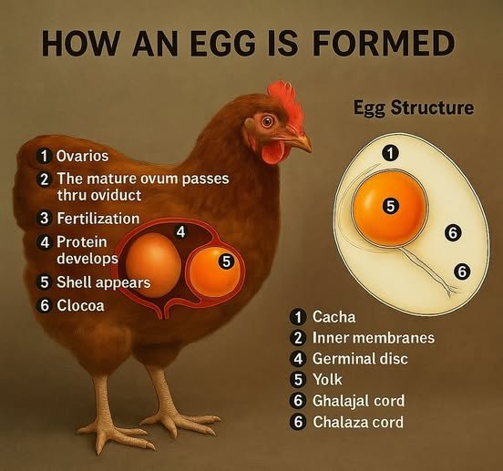 5️⃣ Ljuska se formira u završnom dijelu jajovoda, sastavljena uglavnom od kalcijuma, a boju dobija od prirodnih pigmenata.