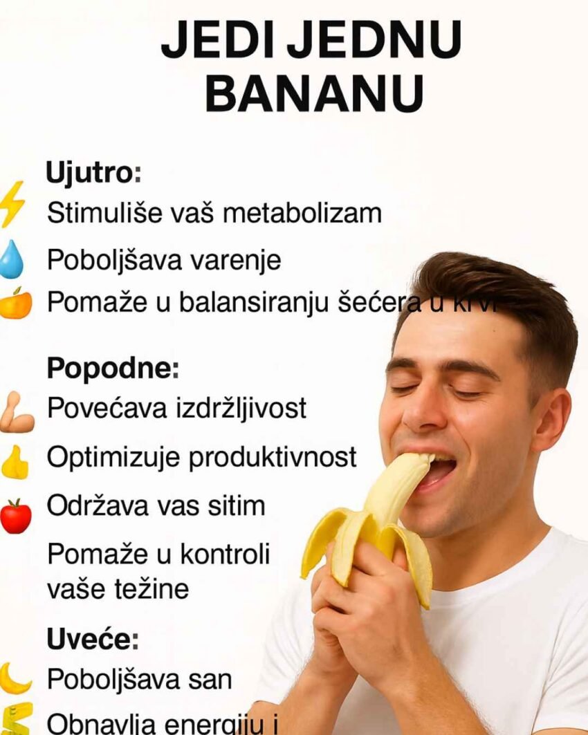 Banana je jedna od najhranljivijih i najpraktičnijih namirnica koje možemo uvrstiti u svakodnevnu ishranu. Zahvaljujući bogatom sadržaju kalija, magnezija, vlakana i prirodnih šećera, ona pruža stabilnu energiju i podržava rad brojnih tjelesnih funkcija. Način na koji utiče na organizam zavisi i od doba dana kada je konzumiramo, pa se njene koristi mogu još bolje iskoristiti ako je jedemo u pravo vrijeme.