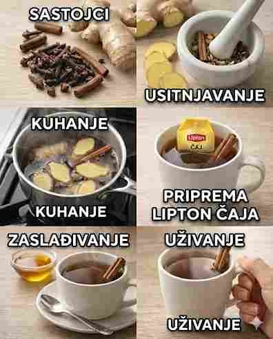 U šolju vruće vode doda se vrećica crnog čaja, nekoliko karanfilića, par kolutića svježeg đumbira i mali komad cimeta. Nakon 5–10 minuta, čaj je spreman. Po želji se može dodati malo meda ili limuna.