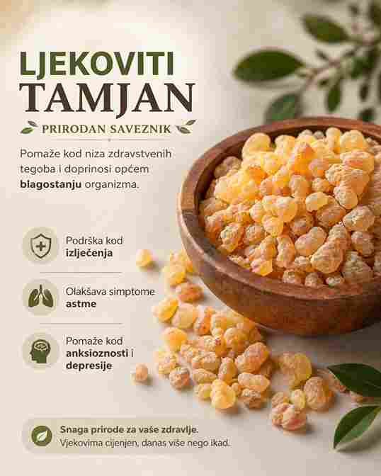 Tamjan je aromatična smola koja se dobija iz drveta Boswellia i koristi se već hiljadama godina u tradicionalnoj medicini. Poznat je po svojim snažnim protuupalnim i umirujućim svojstvima. U narodnoj praksi često se koristi za jačanje imuniteta, smanjenje stresa i poboljšanje općeg zdravlja. Njegova aktivna jedinjenja, posebno bosvelične kiseline, igraju ključnu ulogu u borbi protiv upalnih procesa u tijelu.