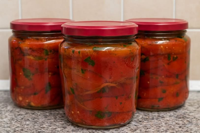 Punjenje tegli – Rasporedite paprike u čiste staklene tegle i prelijte marinadom do vrha.