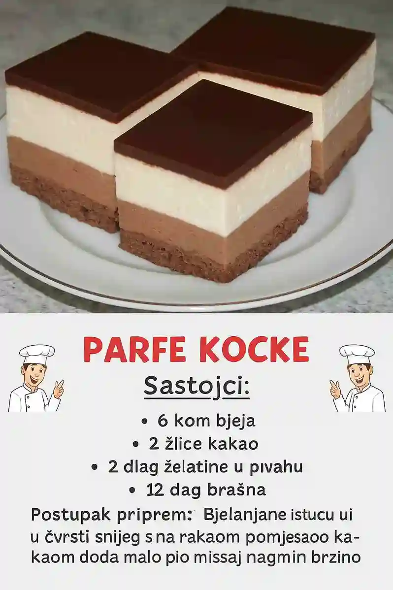 Parfe kocke su jedan od onih kolača koji izgledaju svečano, a pripremaju se bez preteranih komplikacija. Kombinacija mekog biskvita, bogate čokoladne kreme i svetlog, penušavog sloja stvara desert koji zadovoljava sva čula.