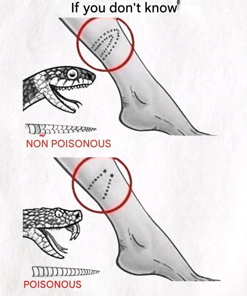 1️⃣ Trag ugriza: neotrovne zmije obično ostavljaju dva mala tačkasta ugriza, dok otrovne ostavljaju V-oblikovani trag.