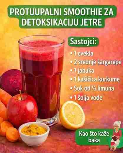 Ovaj domaći sok kombinuje povrće, voće i začine poznate po svojim blagim, ali korisnim efektima na jetru. Redovna konzumacija može pomoći organizmu da se prirodno očisti i da se jetra rastereti.